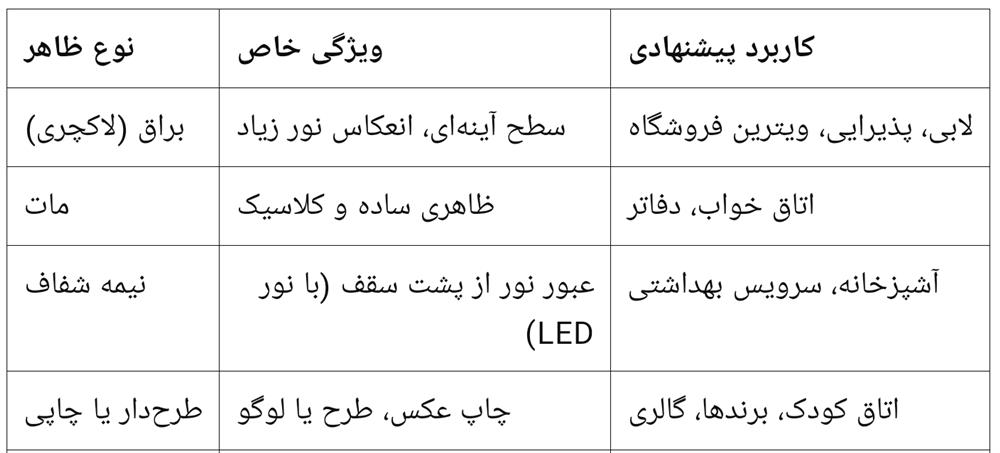 تنوع ظاهری: مات، براق (لاکچری)، نیمهشفاف، آینهای، طرحدار و حتی چاپ دیجیتال